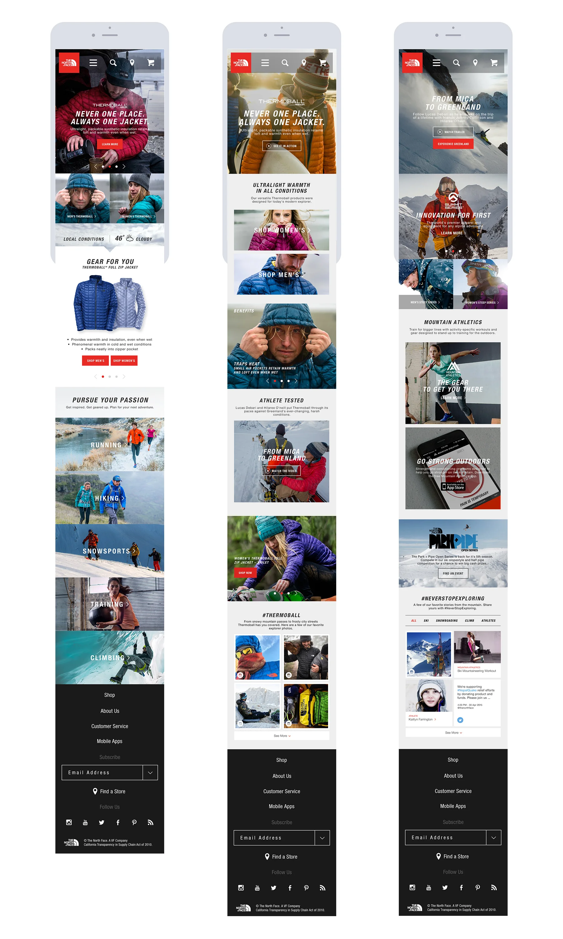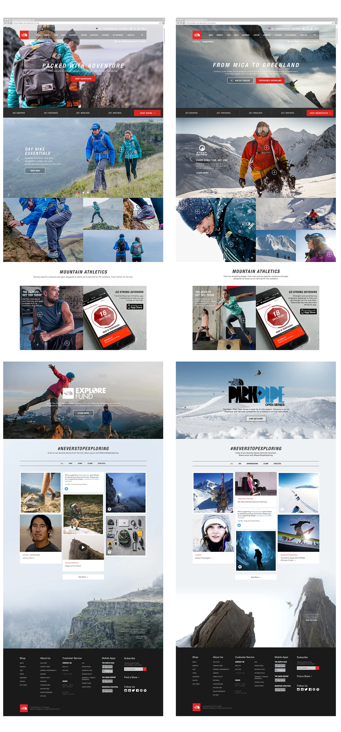 We looked to inject storytelling into the site experience while celebrating their product innovation and global expeditions. We developed a responsive site concept with a design aesthetic that featured visceral outdoor imagery and simplified UI to allow the digital destination to create the feeling of stepping into nature itself. TheNorthFace.com was designed to be the first step in your next adventure.