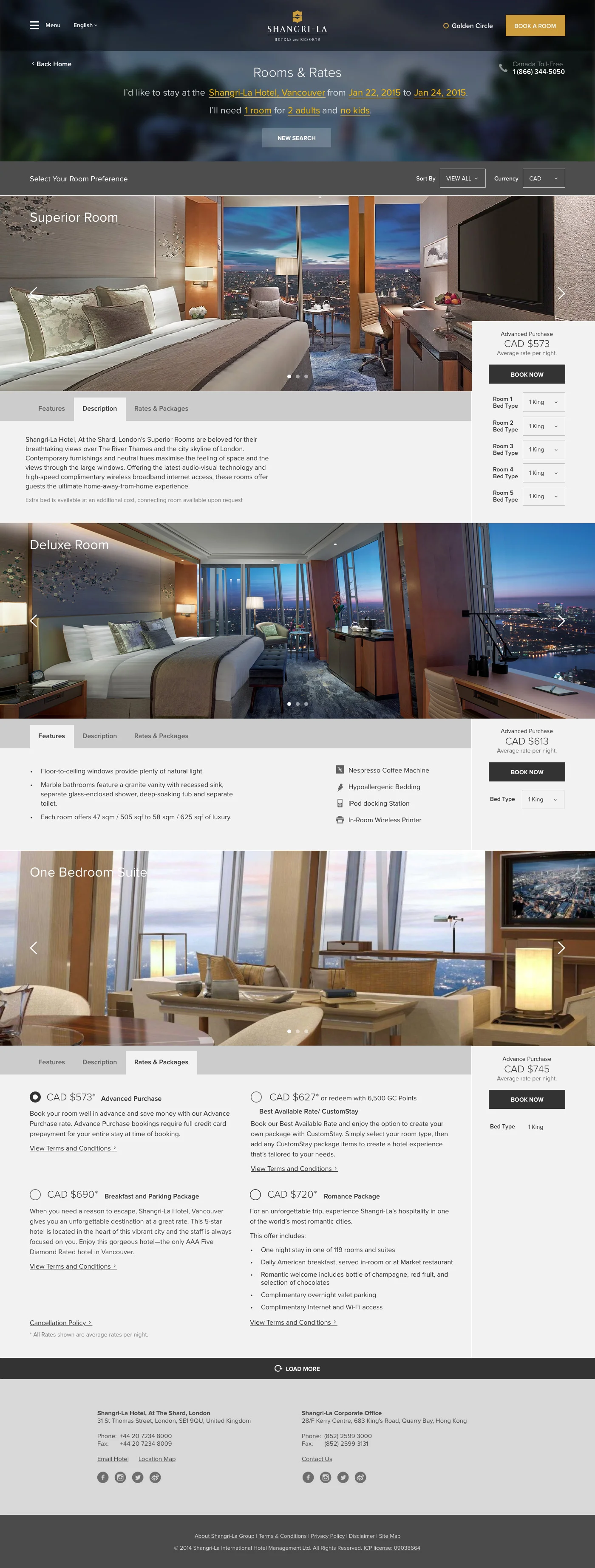 Shangri-La's hotels and guest rooms are meticulously designed and filled floor-to-ceiling with luxury. Image galleries of the hotel and rooms were buried on their existing site. With Shangri-La's new digital experience we wanted the booking process to be a visual exploration that celebrates the 5-star quality and gives the consumer a feel for their future accommodations.